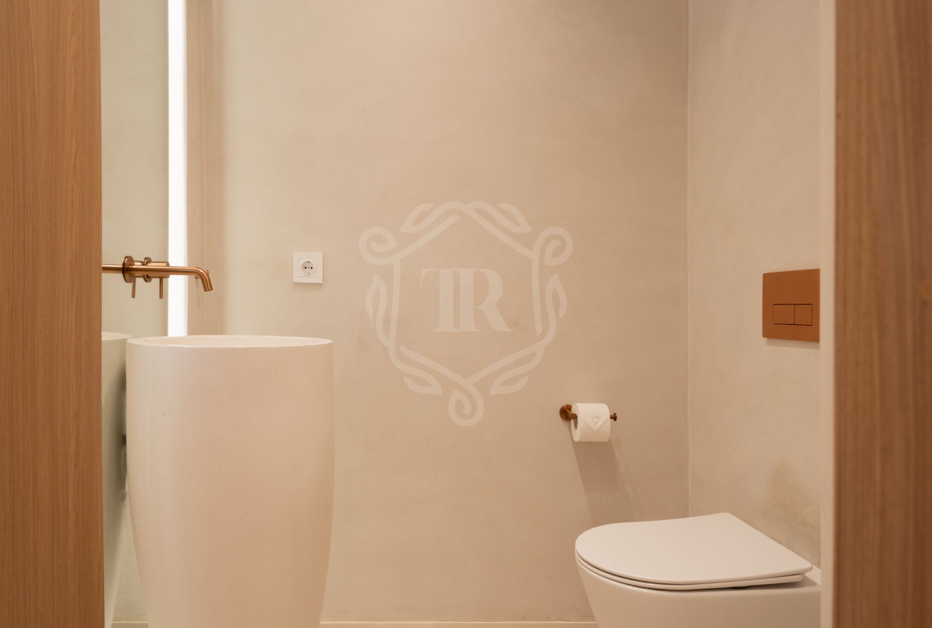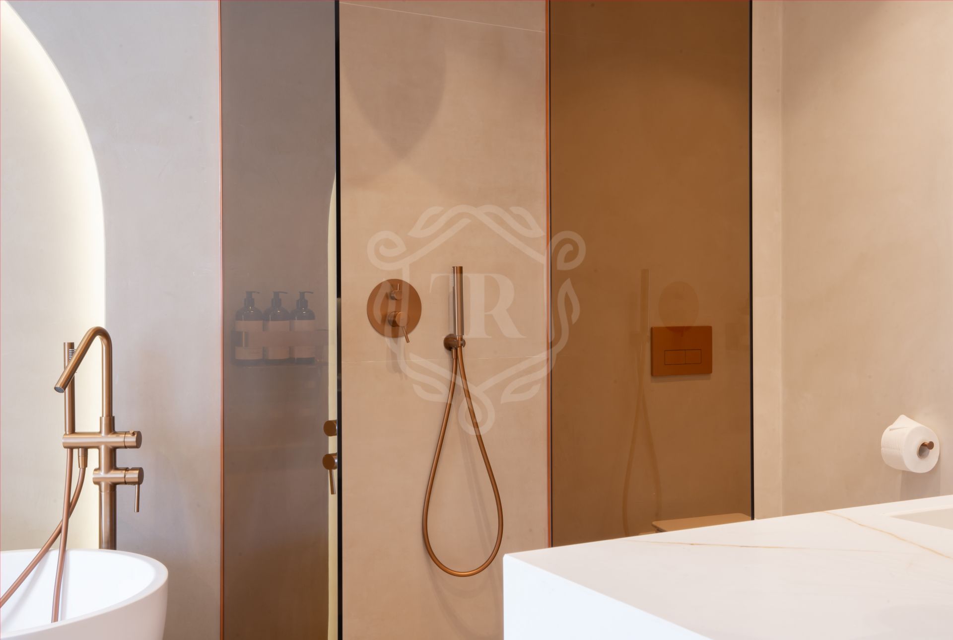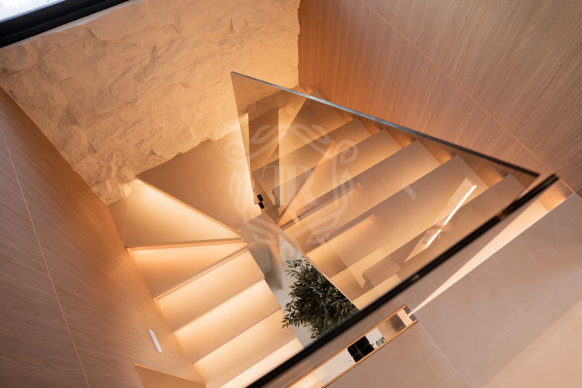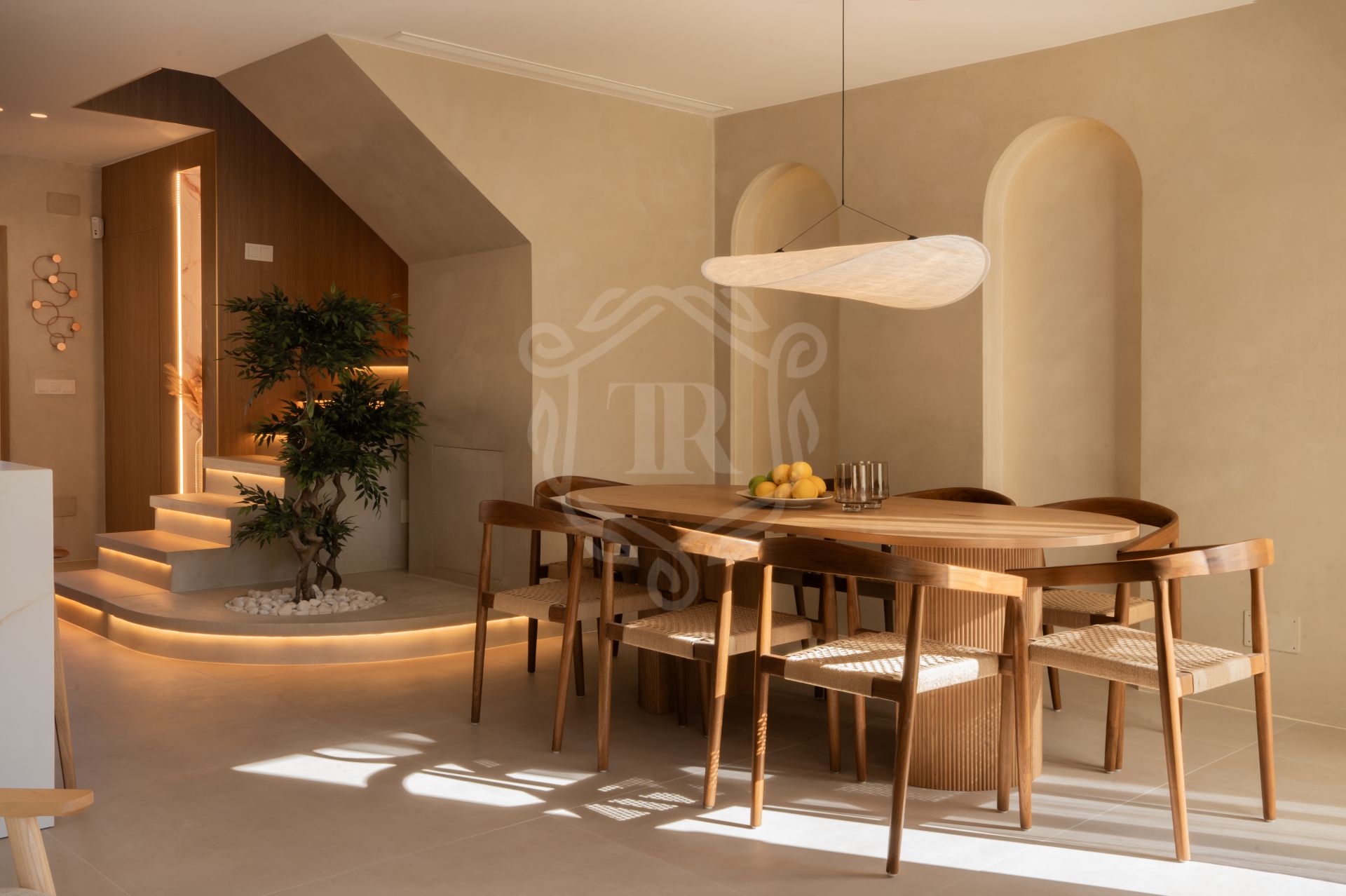 This exceptional home features four bedrooms, one en-suite bathroom, an additional full bathroom, and a guest toilet, offering generous space for family and guests. The renovation is of the highest quality, with exquisite microcement finishes, hidden LED lighting creating a cosy ambiance, and bespoke, custom-made carpentry throughout, giving the home an unmistakable sense of luxury and sophistication.