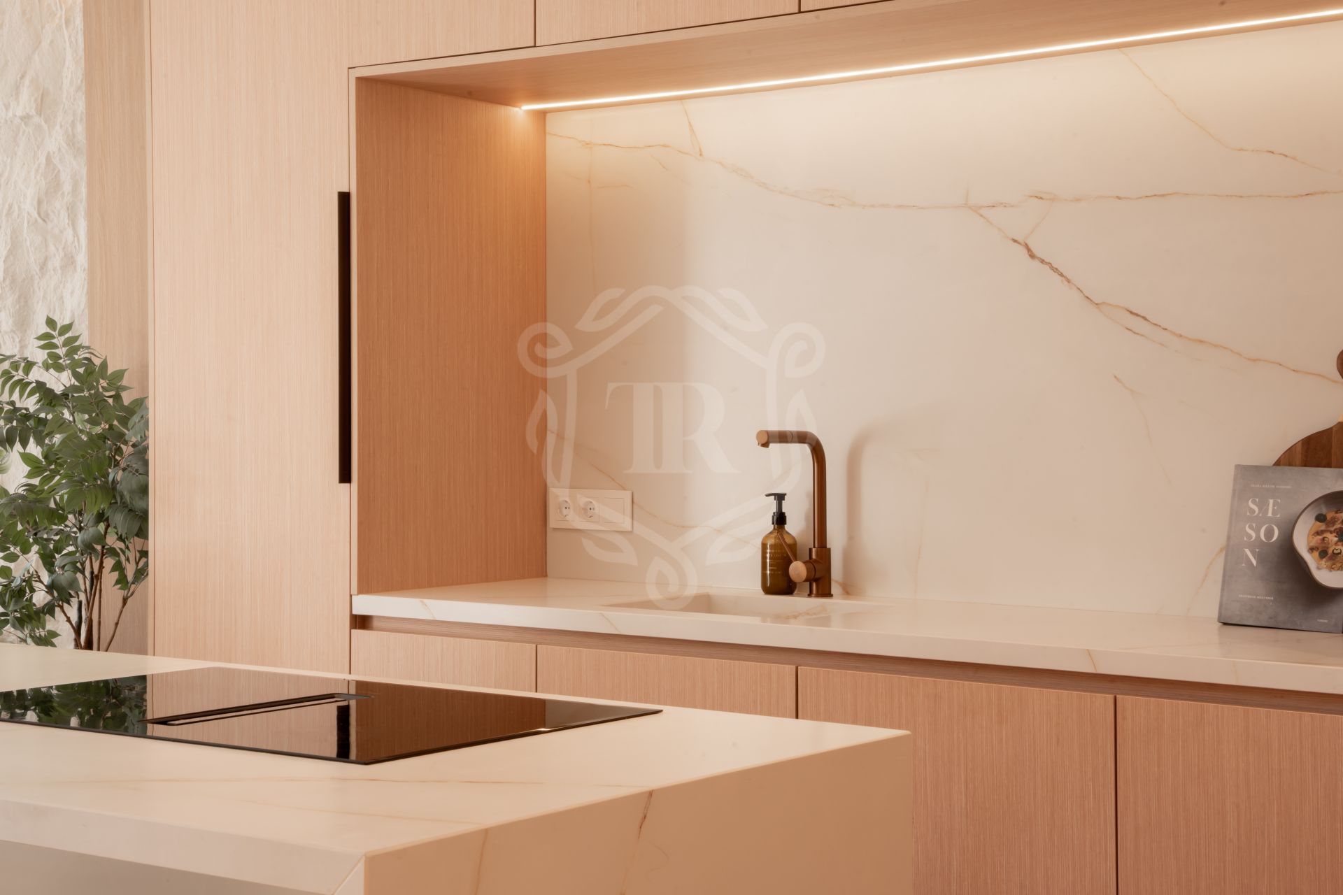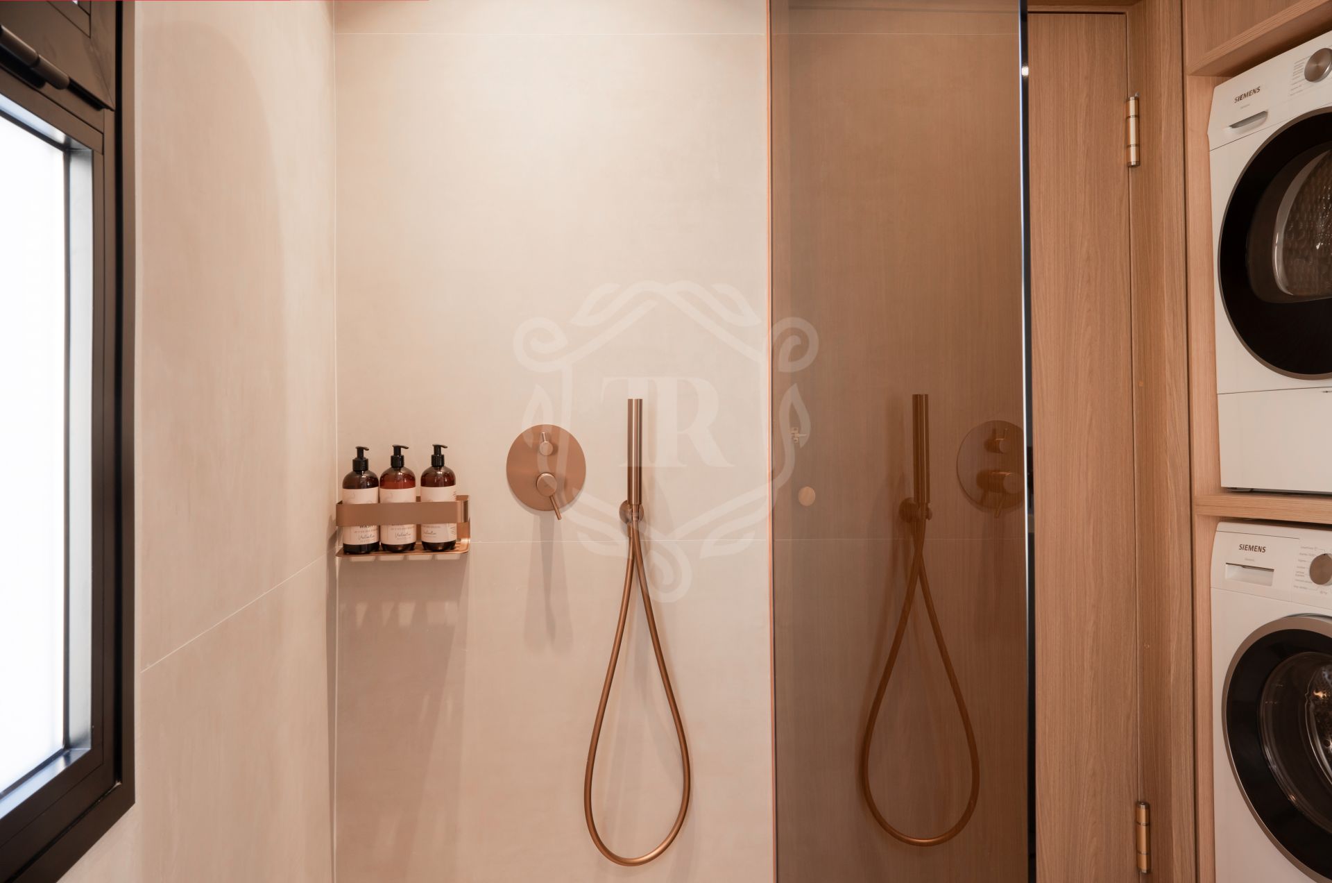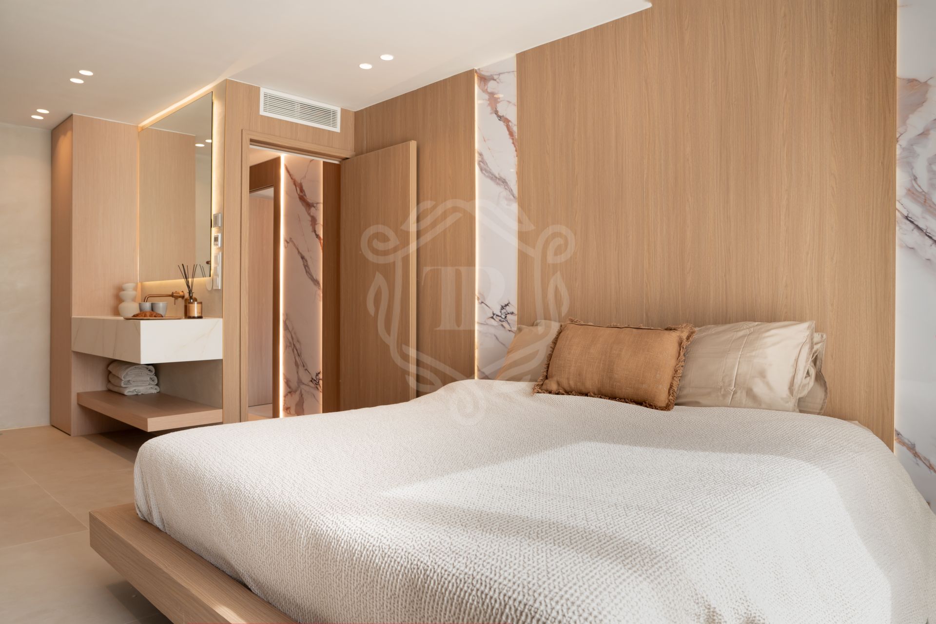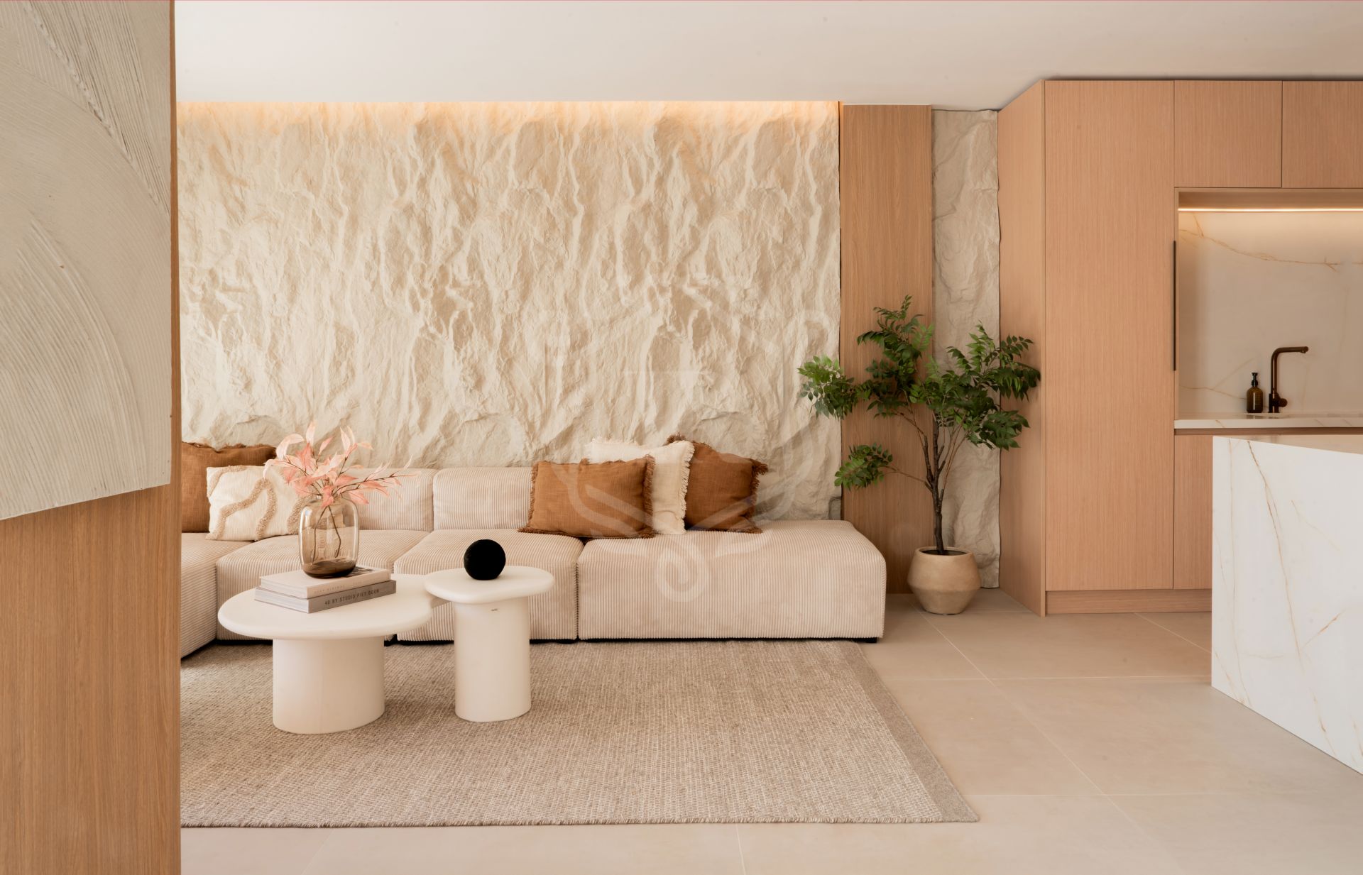 This exceptional home features four bedrooms, one en-suite bathroom, an additional full bathroom, and a guest toilet, offering generous space for family and guests. The renovation is of the highest quality, with exquisite microcement finishes, hidden LED lighting creating a cosy ambiance, and bespoke, custom-made carpentry throughout, giving the home an unmistakable sense of luxury and sophistication.