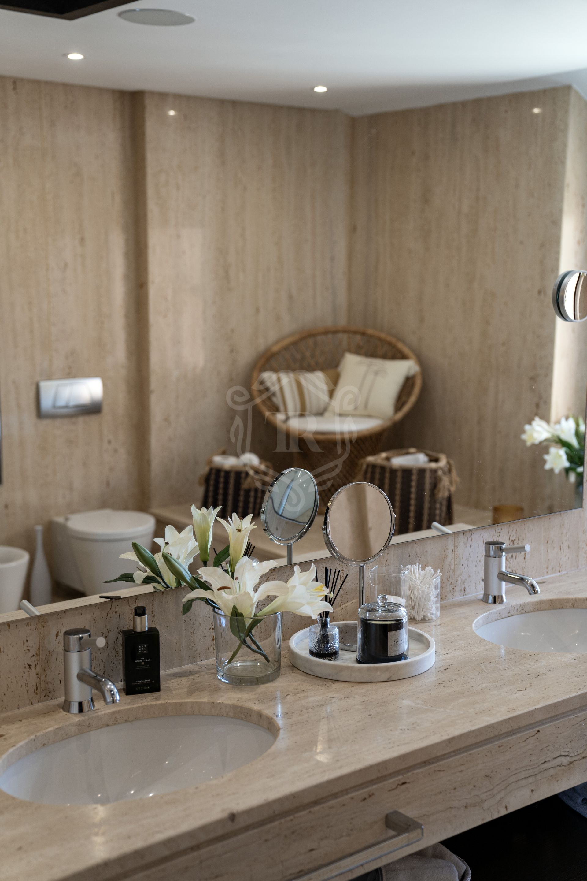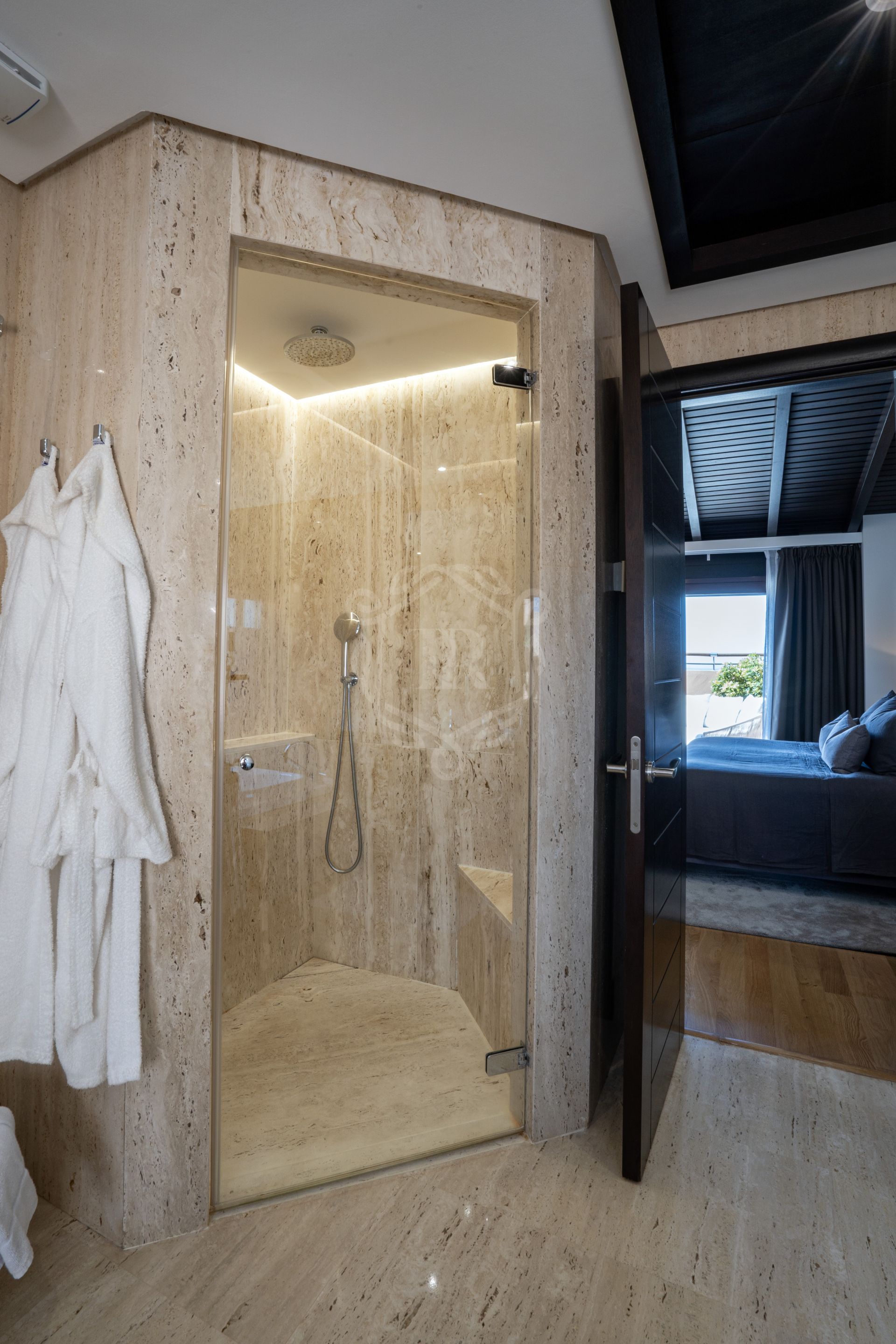 Upstairs, the second level offers a spacious additional en-suite bedroom, alongside the impressive master suite, complete with a luxurious bathroom featuring a jacuzzi tub, walk-in shower, and refined finishes. Both bedrooms share access to an ample terrace boasting spectacular sea views.