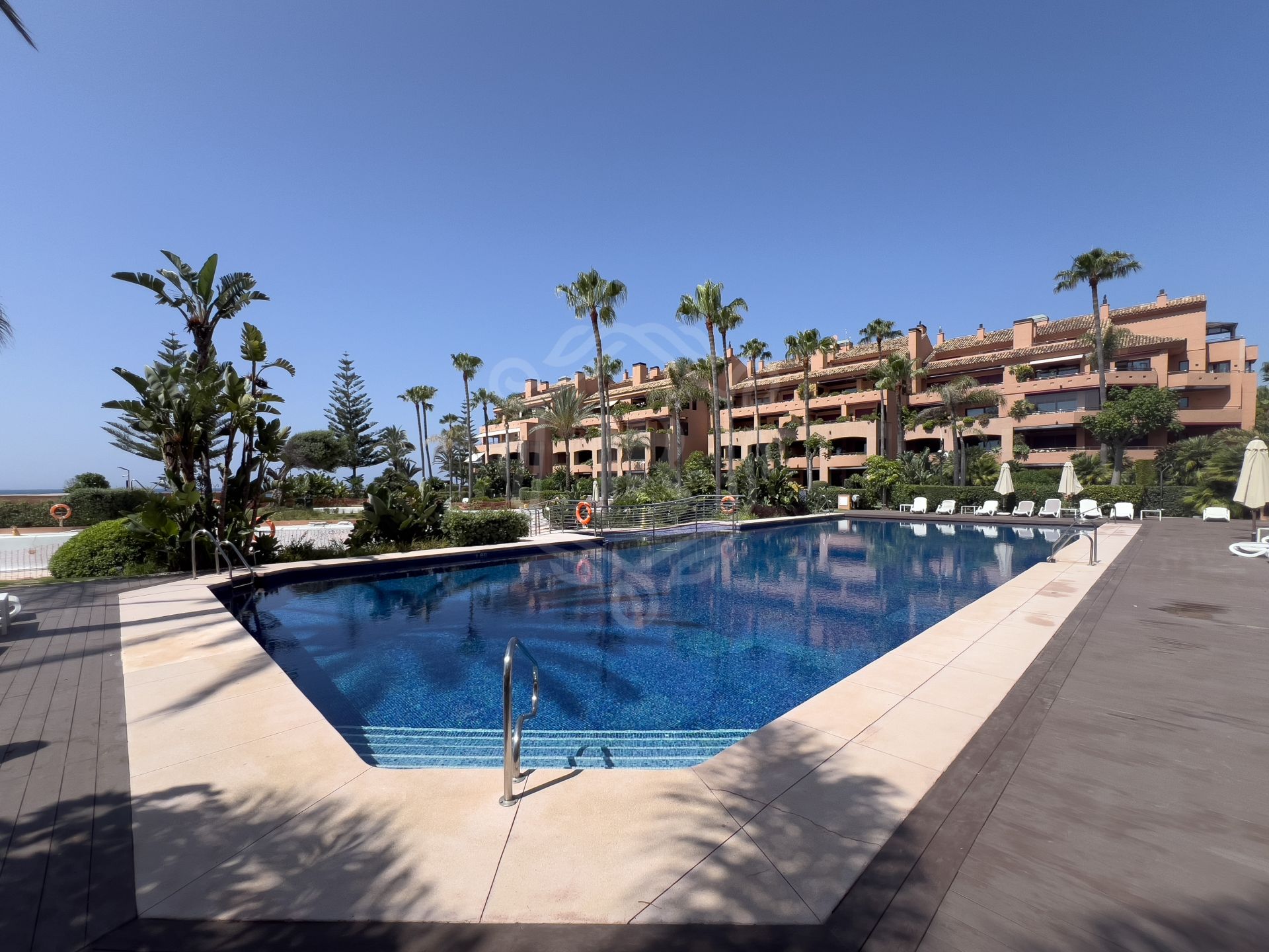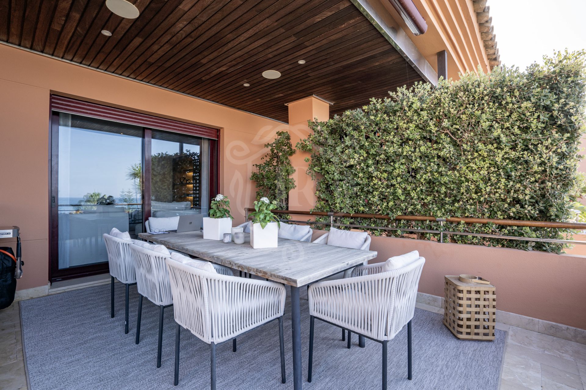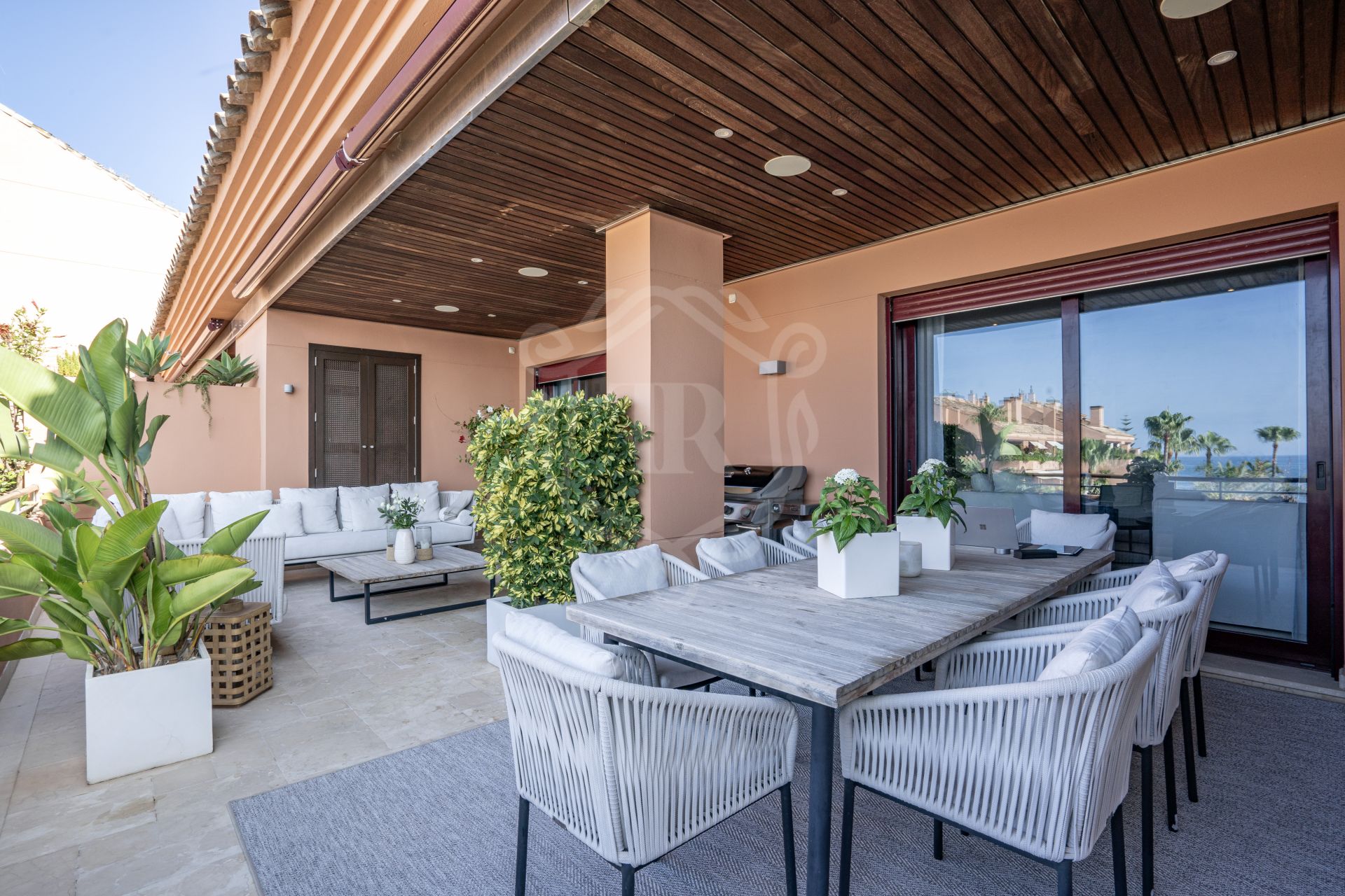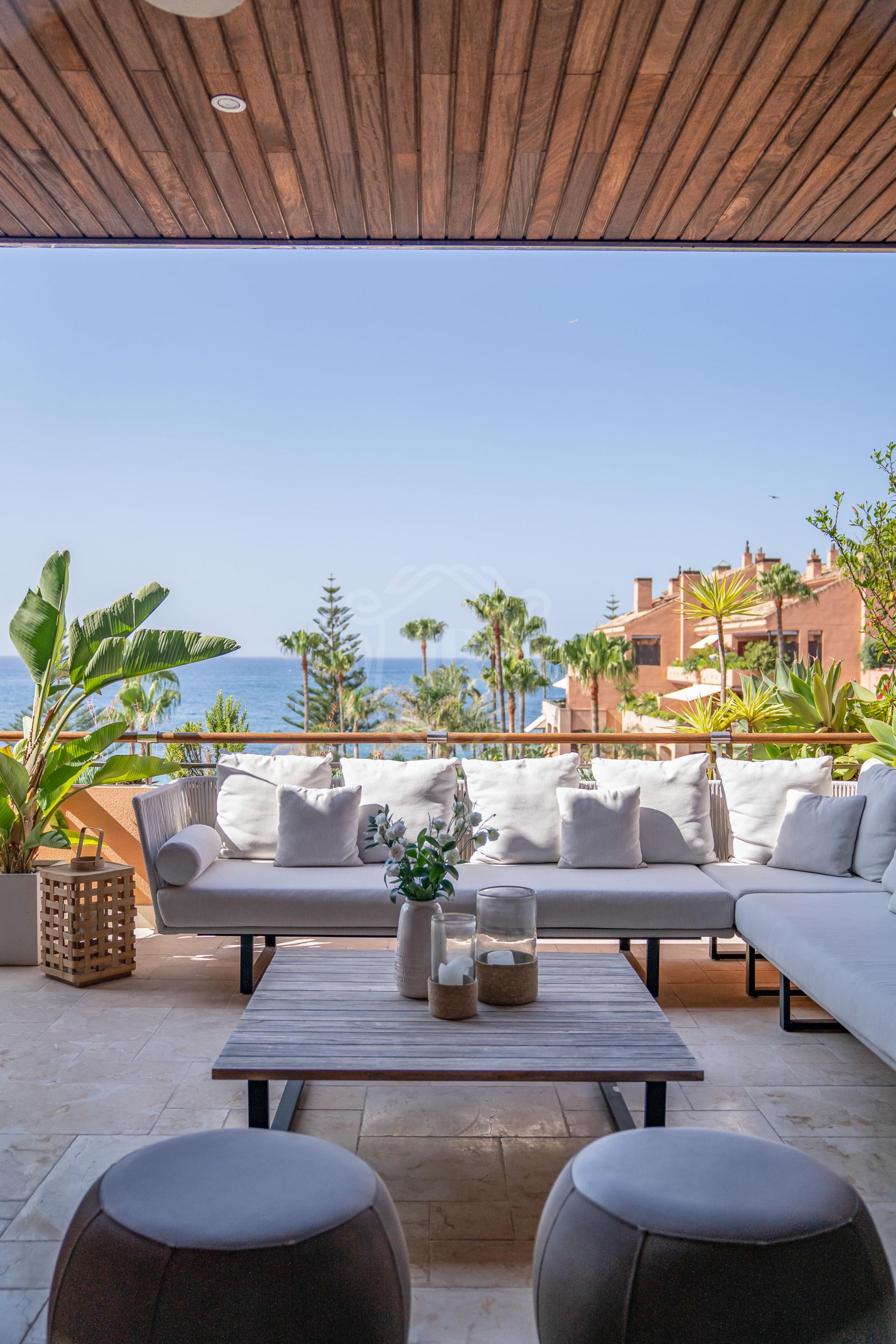 A truly rare opportunity to acquire a fully renovated beachfront duplex penthouse in the prestigious Malibu Residence, offering breathtaking panoramic sea views and convenient access to the beach, Puerto Banus, and San Pedro de Alcantara.