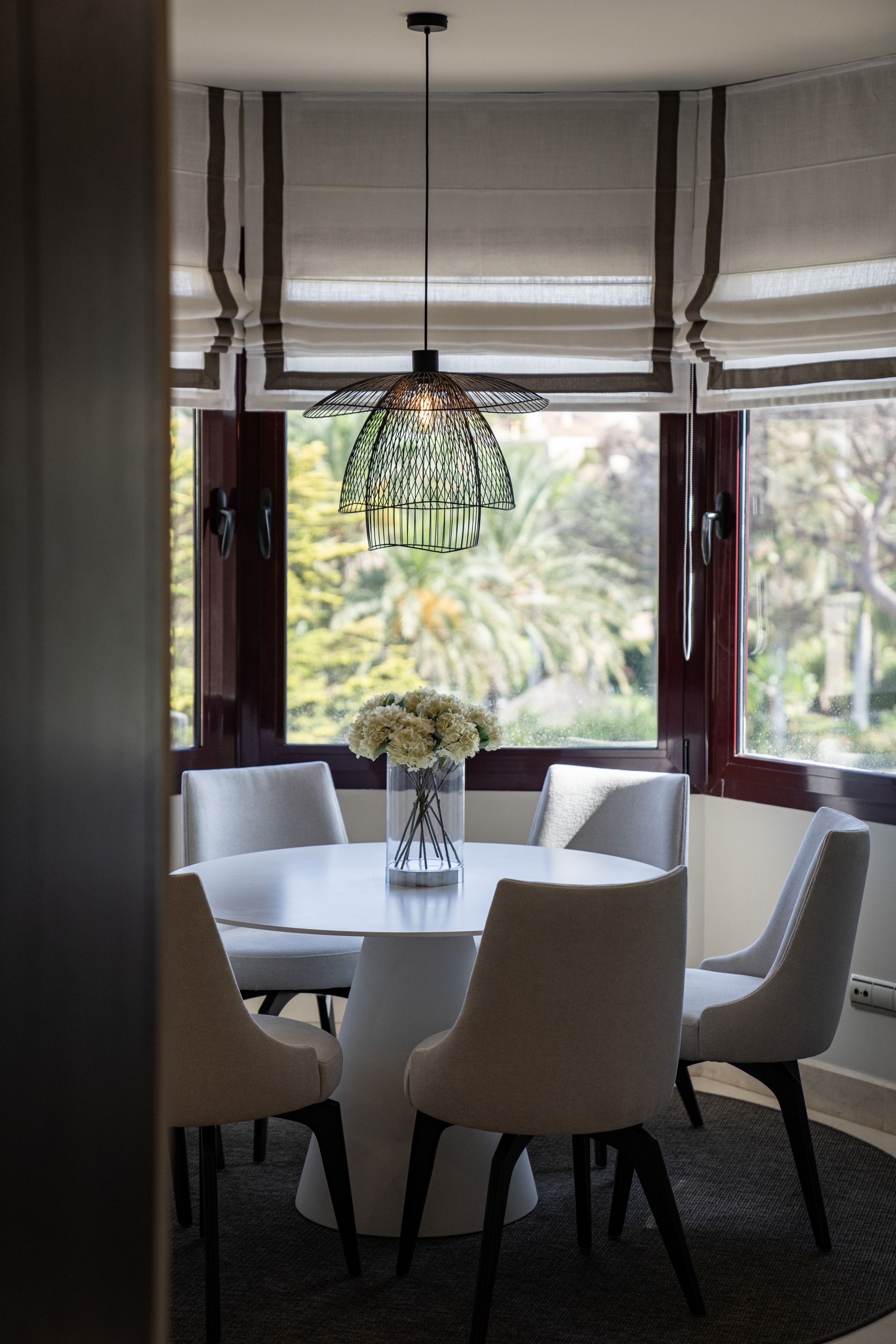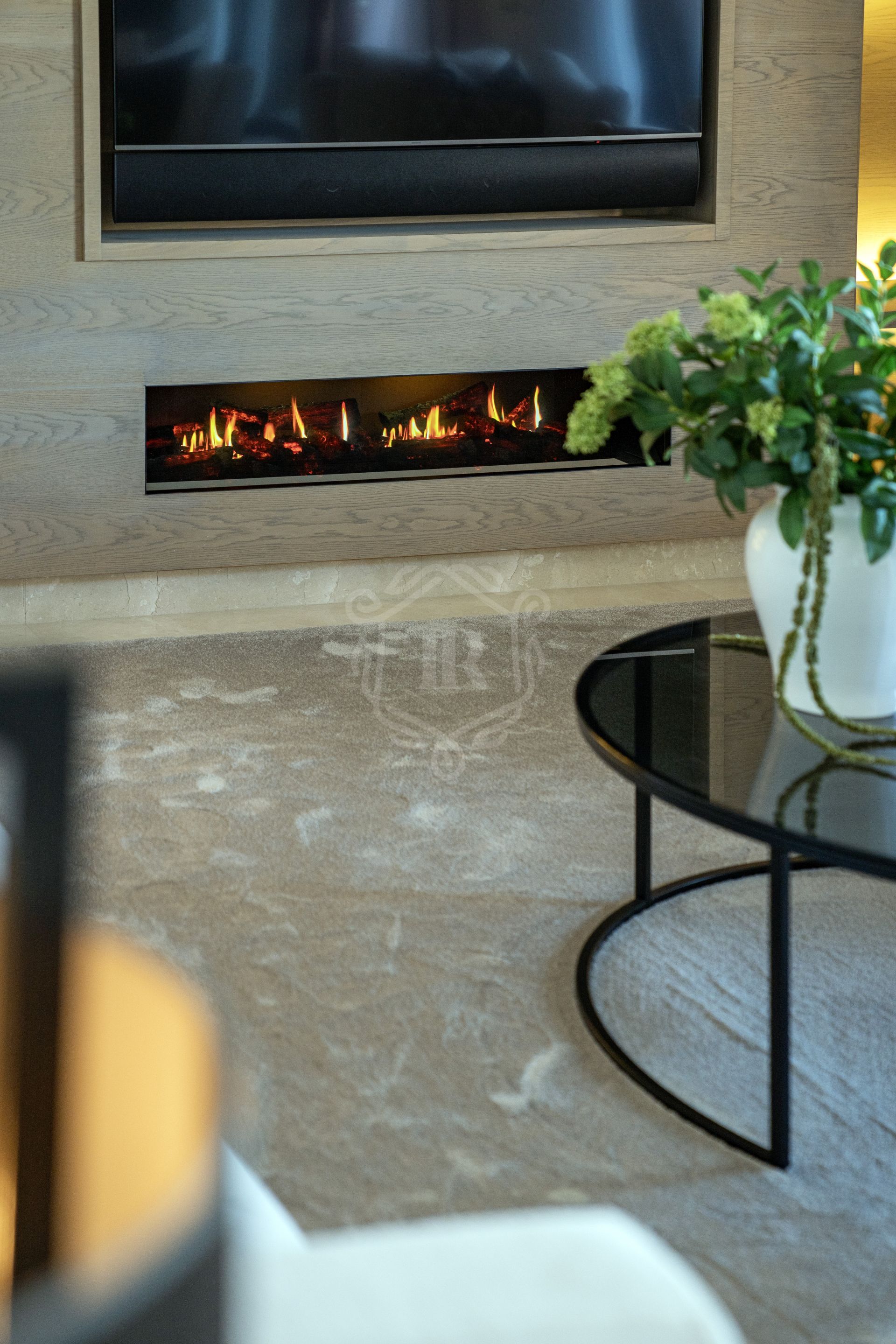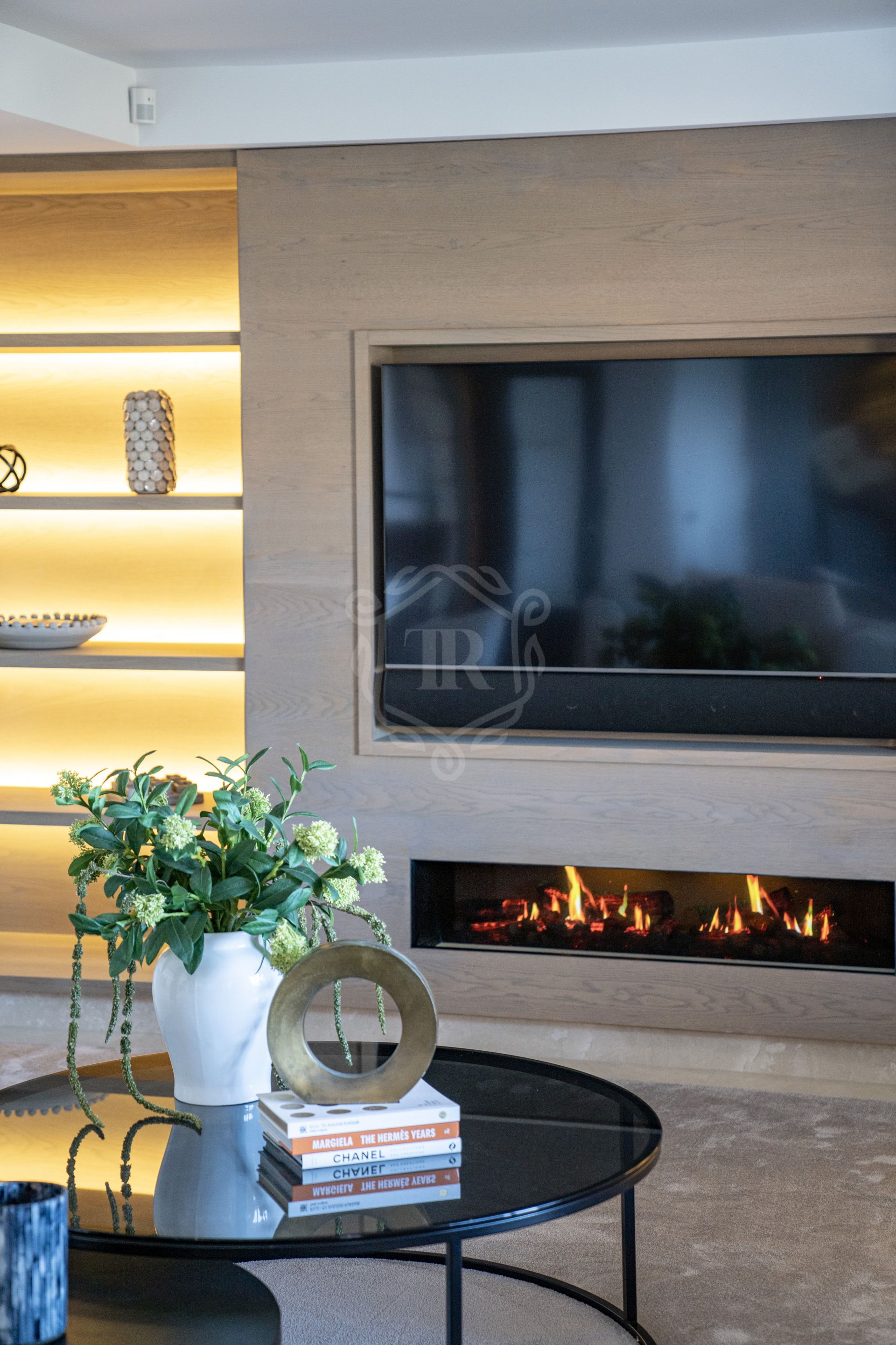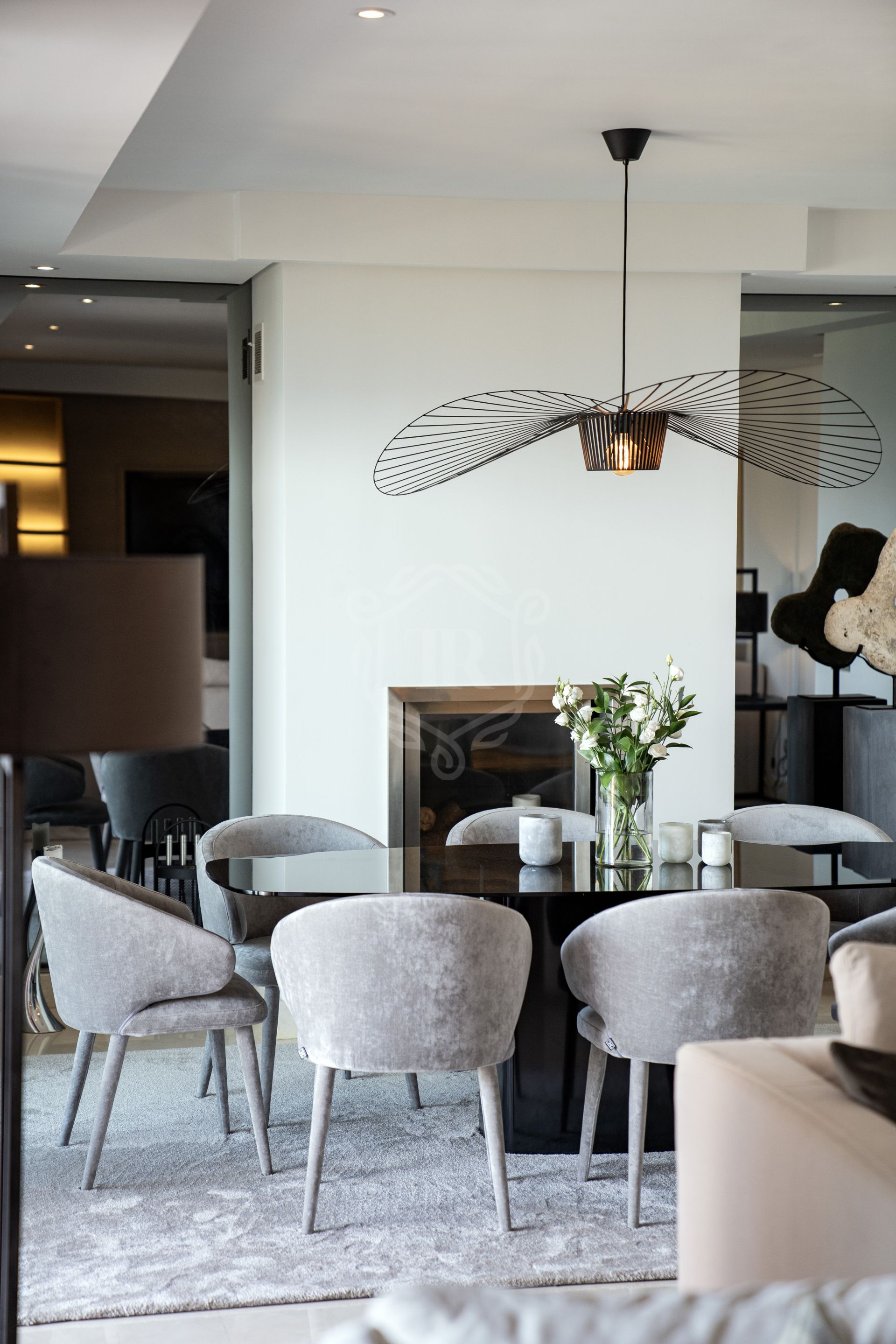 Inside, the residence showcases premium materials and a sophisticated Scandinavian-inspired design. The welcoming entrance hall leads into an expansive open-plan living and dining area, tastefully appointed with comfortable seating and a modern electric fireplace. This elegant space opens onto a generous terrace with stunning sea views—ideal for relaxing or entertaining in style. The sleek designer kitchen is equipped with high-end appliances and includes a separate utility room for added convenience. The main level also features a bright en-suite guest bedroom with its own private balcony enjoying beautiful mountain views.